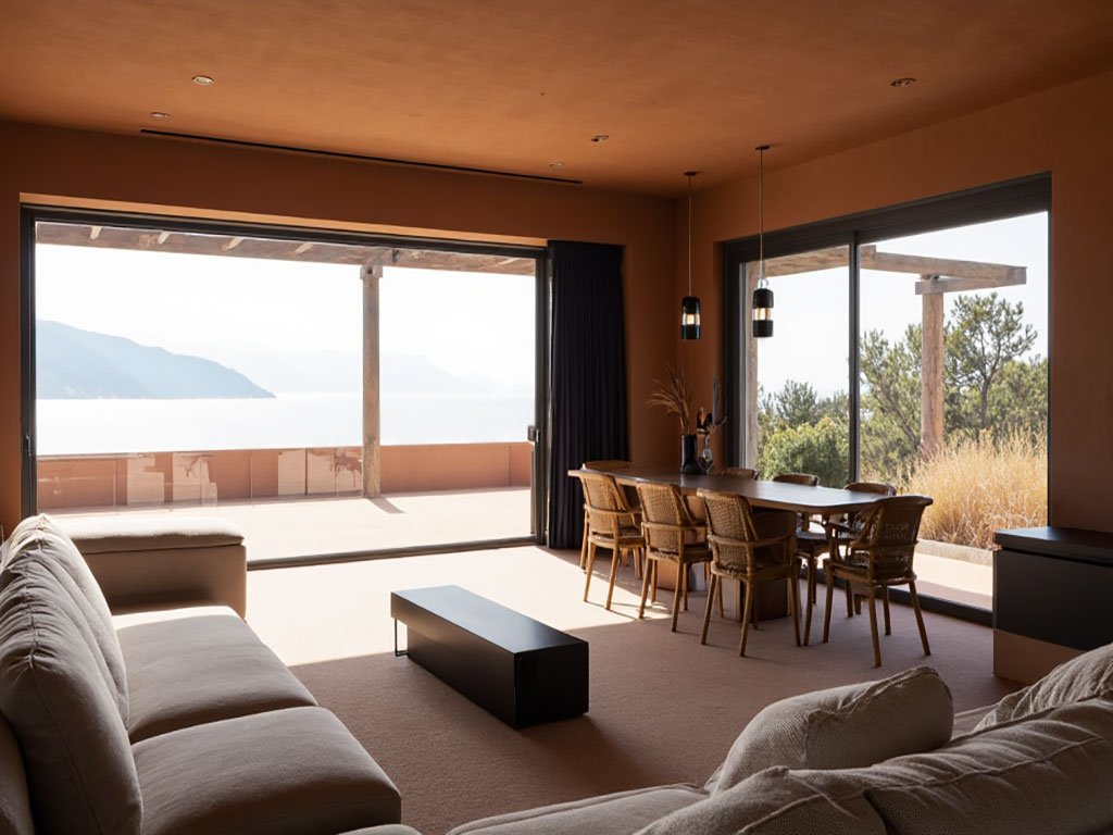 Propusimos una vivienda que evita las fachadas ostentosas o muros completamente vidriados, esos que dan la impresión de que trataran de poner el paisaje como en una vitrina. La casa es mas simple, menos pretenciosa, un lugar que busca la comodidad de dos verdaderos habitantes del lugar. Cada ventana y vista se integran pensando en la vida cotidiana, esa donde el paisaje es contenedor y parte de todo, pero sin robar protagonismo. Es una arquitectura sin artificios, un refugio íntimo para reconectar con lo esencial.